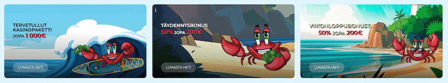 CrabSlots Casino lellii pelaajia 4-osaisella tervetulobonuksella, jolla voi kuitata jopa 1 000 euron suuruiset edut. Ensimmäiselle talletukselle on luvassa ekslusiivinen talletusbonus, joka on saatavilla vain meidän kauttamme.