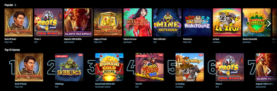 Lucky Fuel Casinon pelivalikoimasta löytyvät niin uutuuspelit kuin rakastetuimmat klassikot, ja käyttäjät pääsevät testaamaan onneaan esimerkiksi Reactoonzin, Big Bad Wolfin ja The Dog Housen parissa. Myös ostobonus- ja megaways-pelejä löytyy sutjakka määrä.