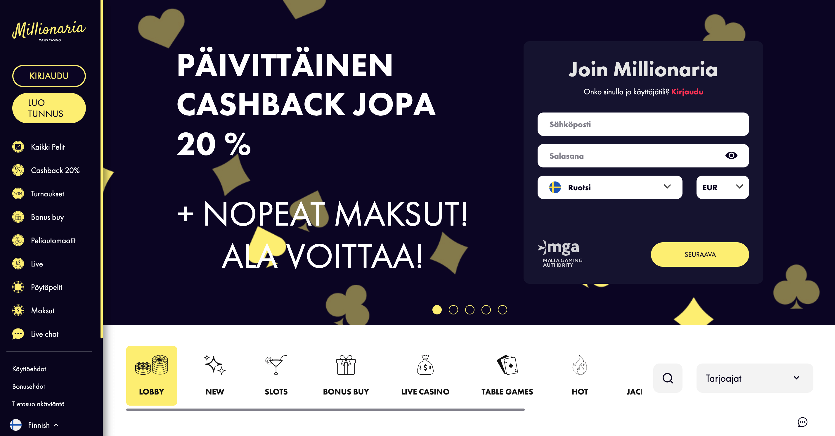 Millionaria Casino on suomeksi toimiva nettikasino, josta löytyy perinteisen talletusbonuksen sijaan käteispalautus. Pelivalikoima kattaa huikean paljon live-kasinopelejä sekä jättipottipelejä ja kaikista voitoista pääsee nauttimaan täysin verovapaasti. Asiakaspalvelu kaipaisi vielä lisää suomenkielisiä agentteja ja joidenkin makuun bonuksia ei välttämättä ole tarpeeksi tarjolla, mutta kyseessä on silti varsin toimiva kokonaisuus!