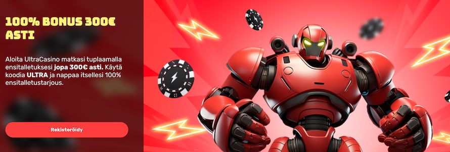 Uusille asiakkaille Ultra Casino tarjoaa tervetulotarjouksena 100 % talletusbonuksen jopa 300 euroon asti. Ultra Casinon kasinobonus on lunastettavissa ensitalletuksen yhteydessä käyttämällä koodia ULTRA. Koodin pääsee syöttämään klikkaamalla talletuskentän vieressä/alla olevaa ”Lisää bonus” -painiketta.